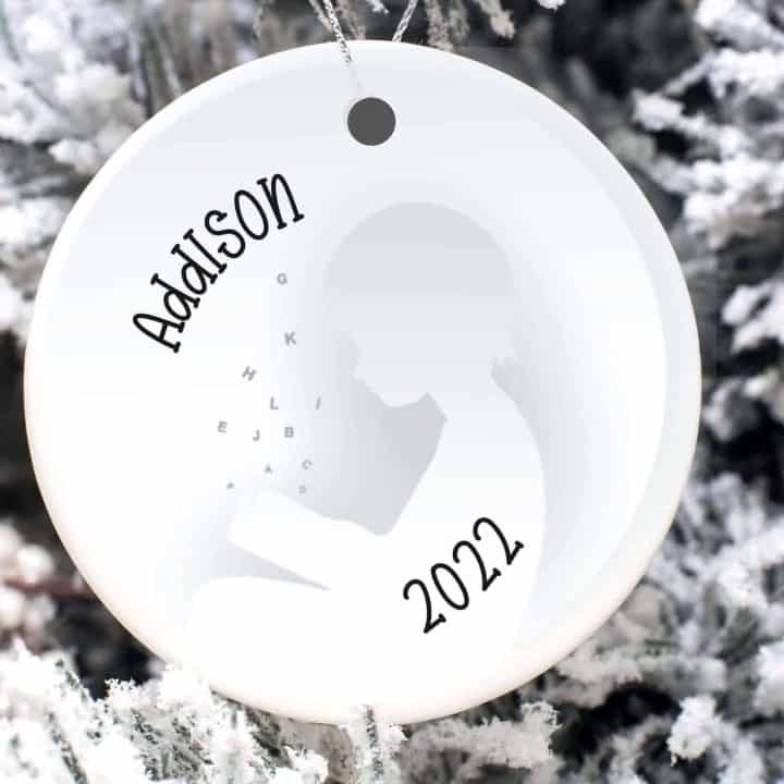 Know a child that spent the year with their nose in a book, or learning to read? Commemorate it with a custom ornament that features their name and the year.